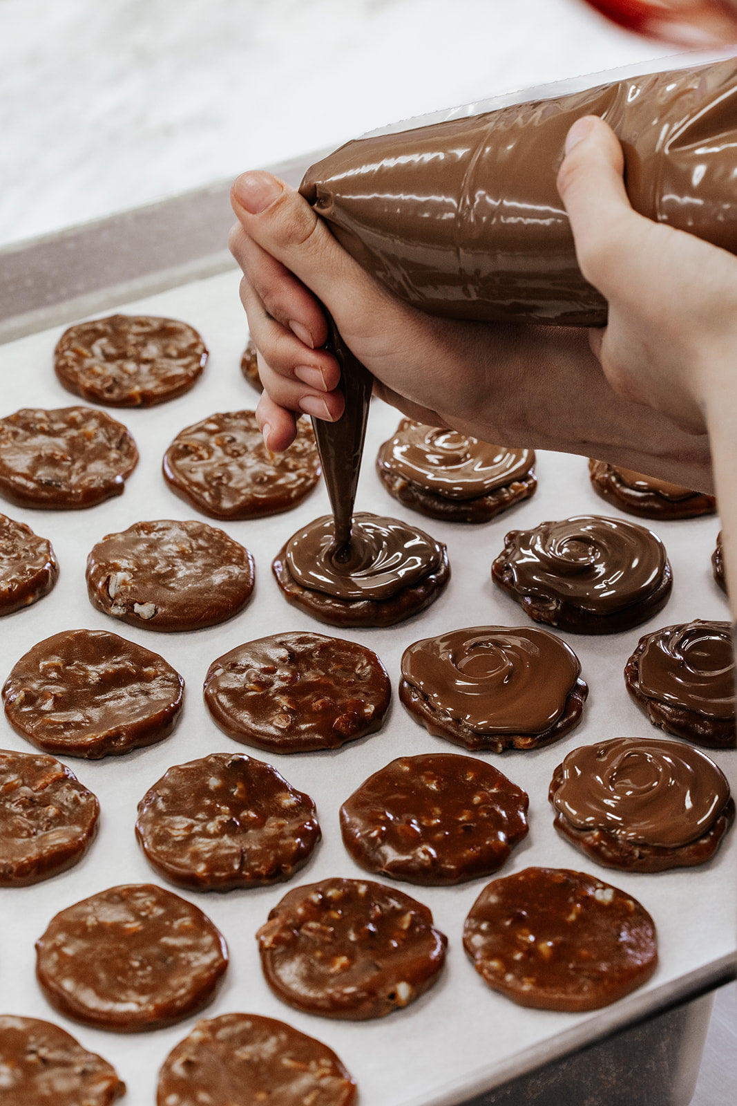 Rich, shiny chocolate encases swirls of creamy gourmet caramel infused with freshly chopped nuts. We hand-pipe them one by one, then hand-package them with care. Pecans, almonds, or cashews; milk or dark chocolate...it's your decision. Odds are, once you get them home, you'll cut one in half, thinking you'll "save half for later." But you'll end up quickly reaching for that second half without a second thought. Because they're that delicious. We like that. We do it too. Indulge.