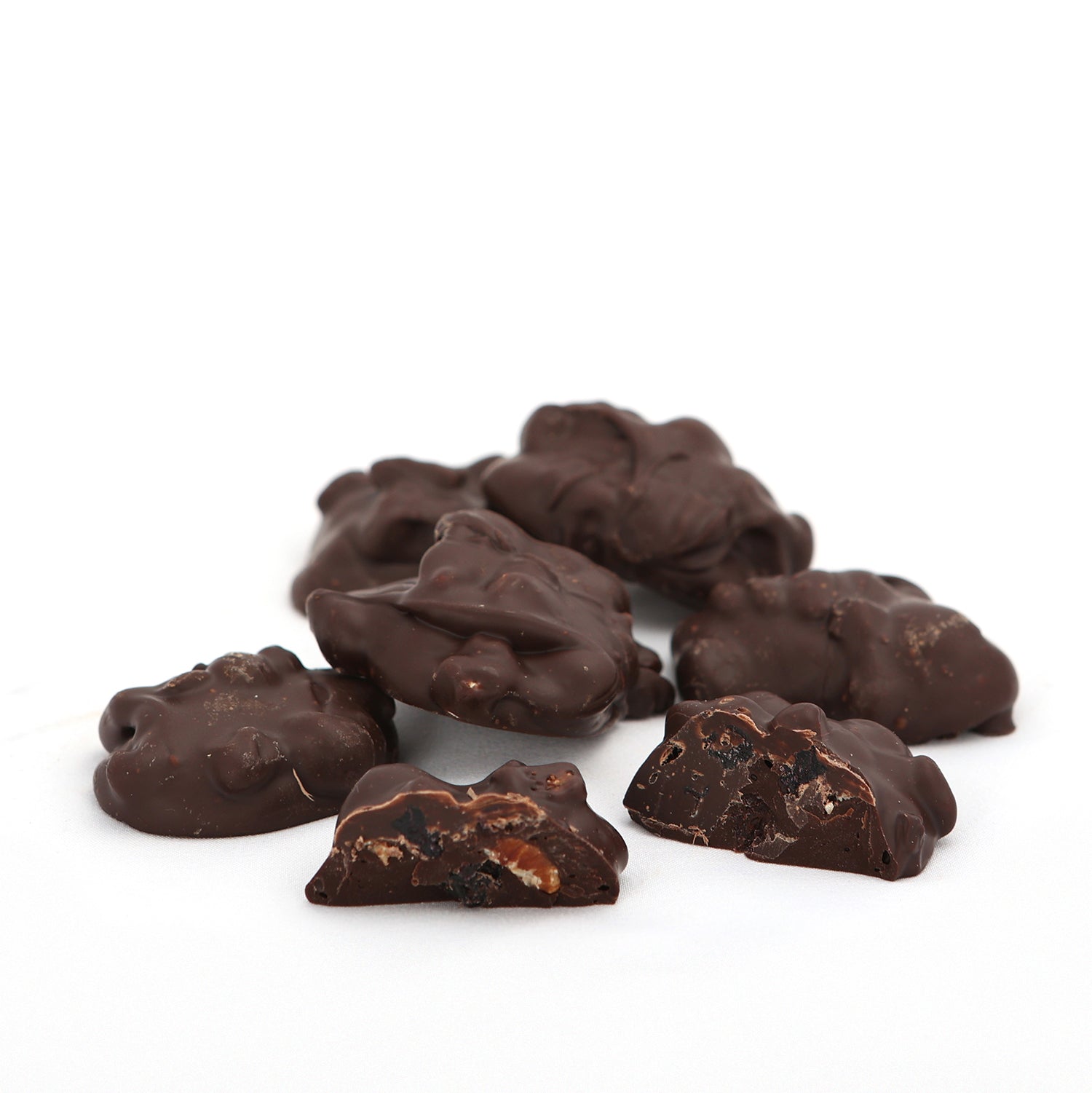 Blueberries, pecans and chocolate, all combined in our tasty clusters. 8 oz. bag in dark chocolate.