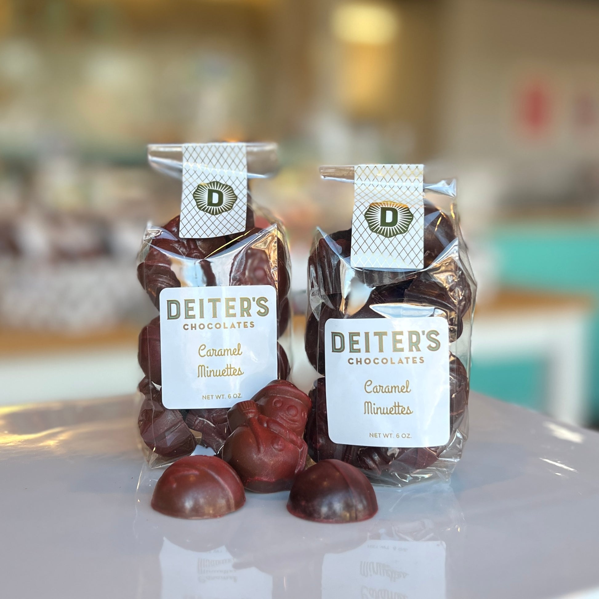 Our tasty minuettes feature a sweet and rich caramel filling in shapes of little snowmen and ornaments. 6-oz. bag in your choice of milk or dark chocolate.
