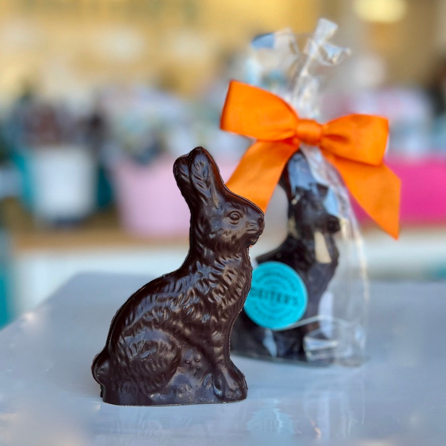 At 4.75" tall and wrapped with a colorful bow, our smaller bunnies are just the right size to add to a basket of Easter goodies. 3.5 oz in your choice of milk, dark or white chocolate.