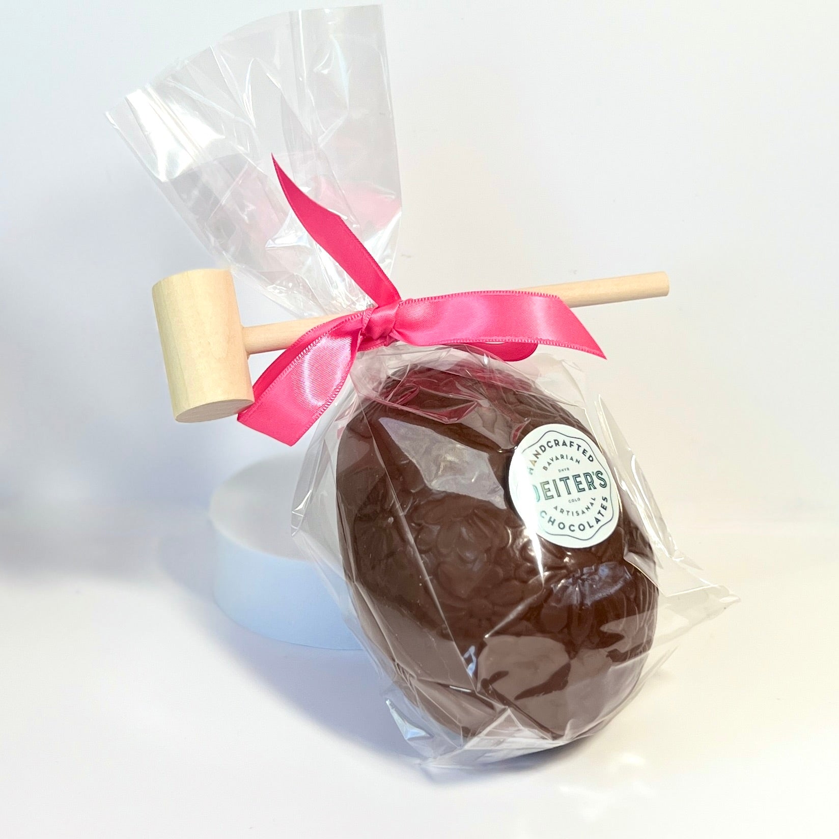 New this year! Our chocolatiers have created this delicate, surprise chocolate egg...use the wooden mallet to crack it open and find it full of colorful nonpareils. Your choice of milk or dark chocolate. 8.5-oz.